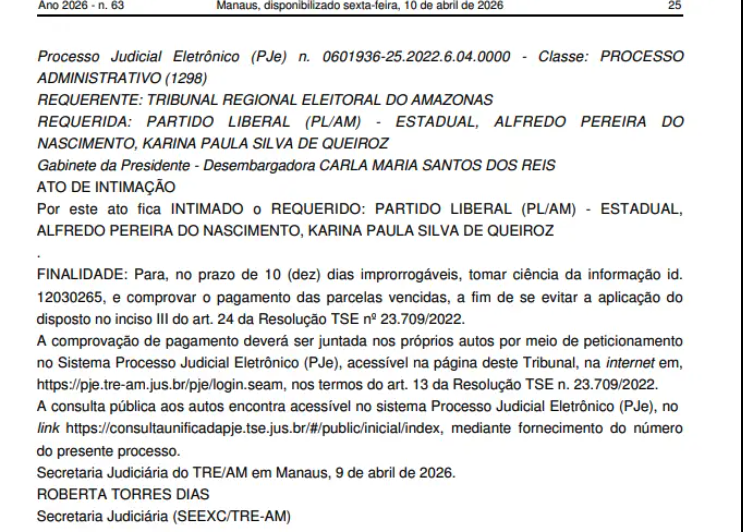 Segundo o documento ao qual o Foco teve acesso, a Justiça Eleitoral fixou um prazo de 10 dias improrrogáveis para Alfredo Nascimento comprovar o pagamento, sob risco de penalidades previstas no inciso III do art. 24 da Resolução nº 23.709/2022 do Tribunal Superior Eleitoral (TSE).