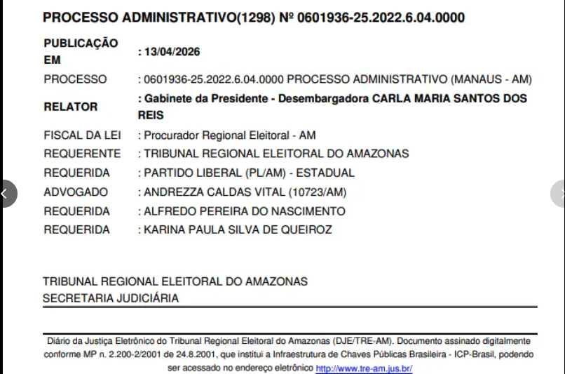 O presidente do Partido Liberal no Amazonas, Alfredo Nascimento, foi acionado pelo Tribunal Regional Eleitoral (TRE-AM) para comprovar o pagamento das parcelas vencidas, no âmbito de um processo administrativo por supostas irregularidades na prestação de contas nas eleições de 2022.